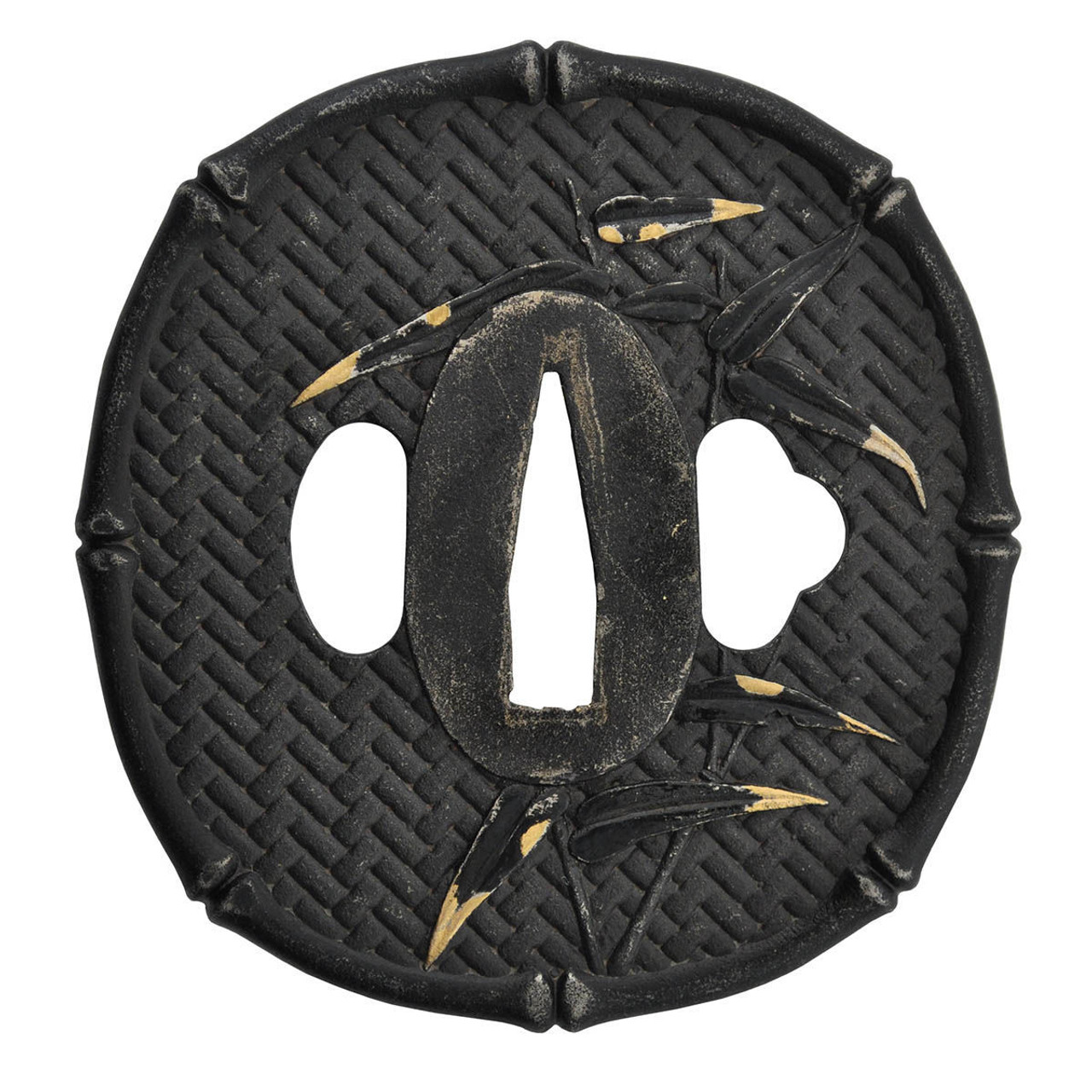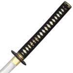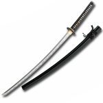 The Bamboo Mat Katana combines impressive performance with a striking O-choji hamon. The bamboo-themed black iron tsuba is textured in a bamboo mat design with a jointed bamboo rim that is highlighted with gold-tipped bamboo leaves. The fuchi/kashira follow the same theme and the golden menuki feature a pair of sparrows. The saya is finished in high-gloss lacquer with horn fittings.