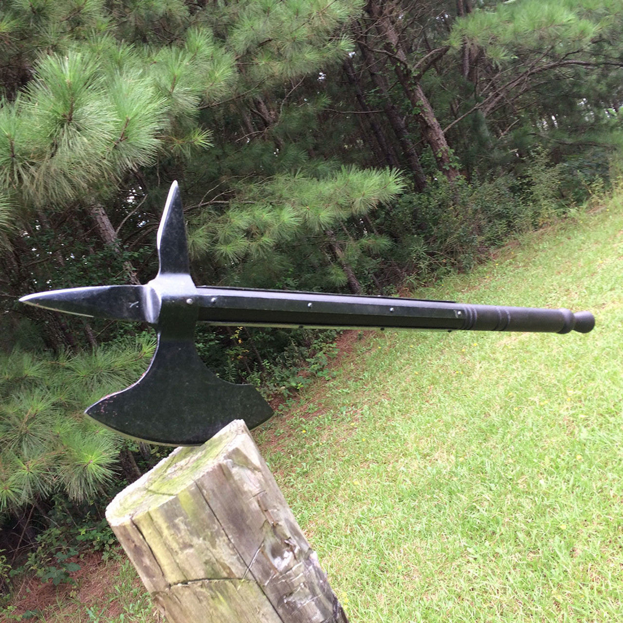 Designed specifically to be used and made from 1065 high carbon steel with a darkened, battle-hardened finish and tempering to a low 50s RC. This sharpened blade has gone through rigorous testing. The axe head has a back spike and a sharpened top spike. The long langets are pinned to a stained and turned hardwood shaft. The hands-on nature of the manufacturing by master smiths makes this line unique. Includes certificate of authenticity signed by each smith that touched your blade through every step of the forging process. Each axe weighs around 3 lbs and is individually inspected to ensure that it is as strong and finely made as the warrior carrying them.