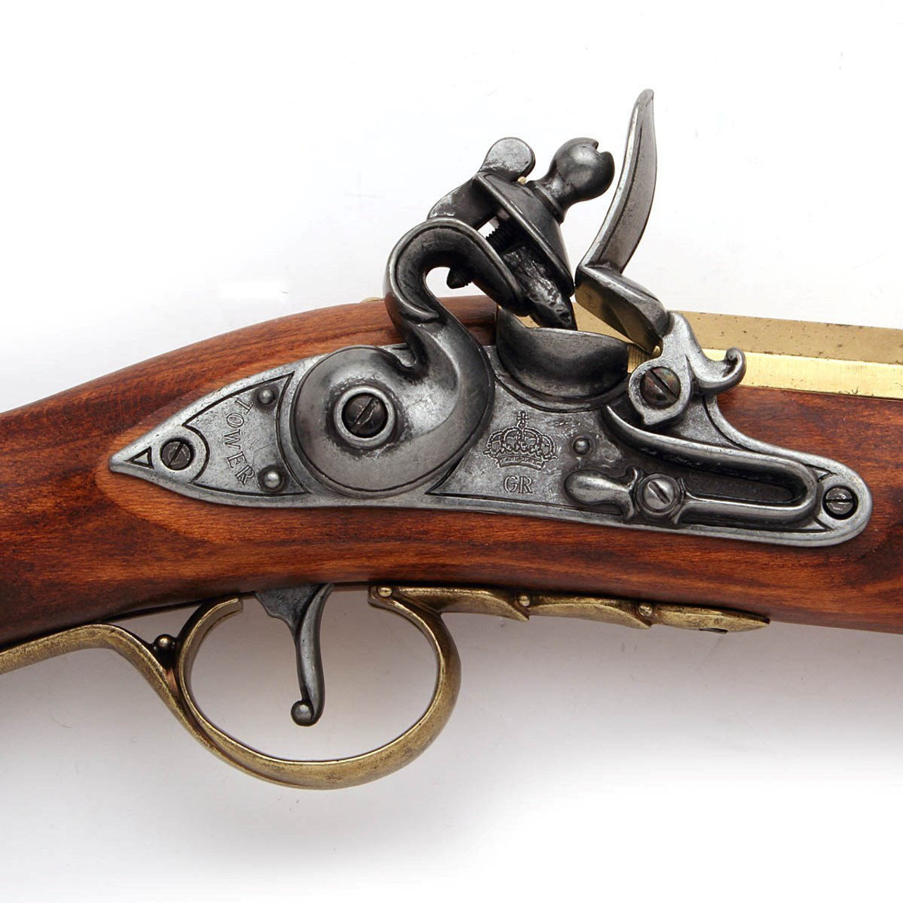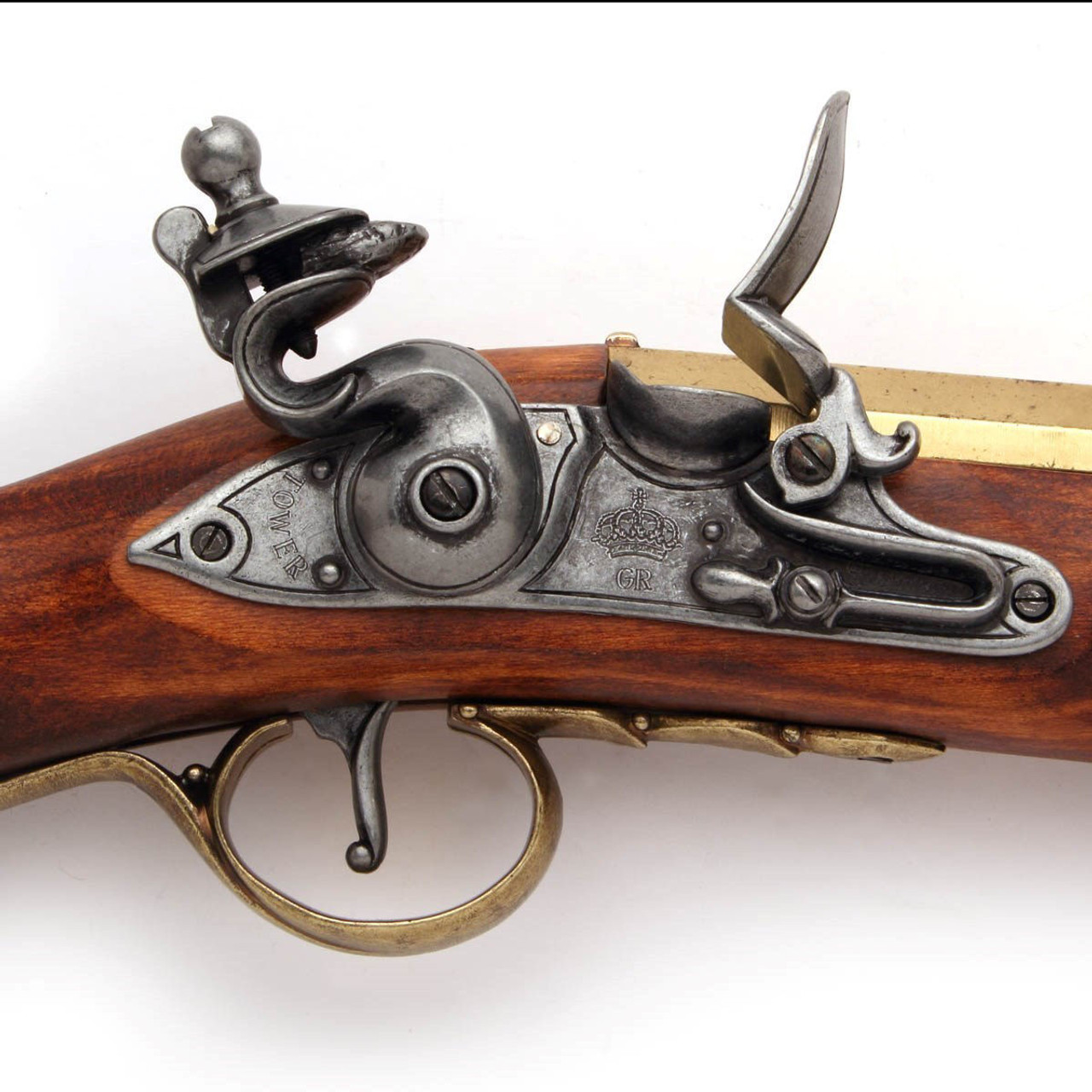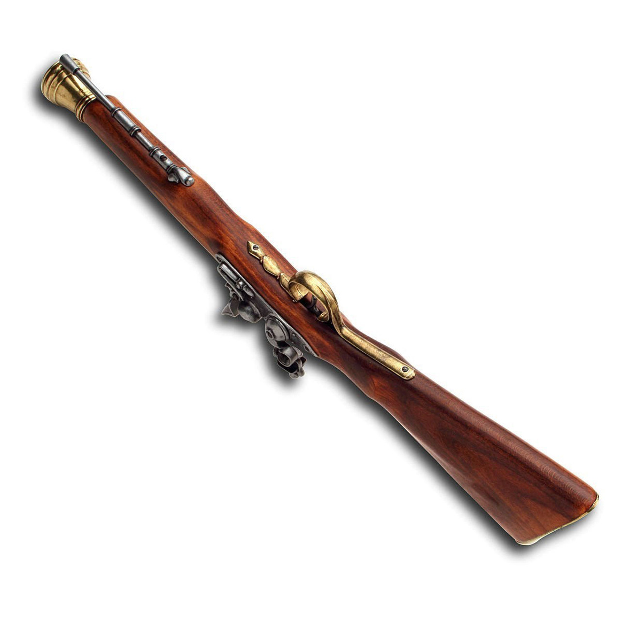 This is a massive version of the boarding blunderbuss firearm. It’s wide, intimidating barrel could spray an area with nails, glass, shot, rocks, almost anything that could be loaded into it for close-quarters combat. Very popular among pirates and aboard ships. Features working flintlock mechanism and full wood stock and brass finish barrel. Cast metal parts, non firing. 26″ overall, just over 3 pounds. This beauty even has markings from the Tower and other British stamps.
