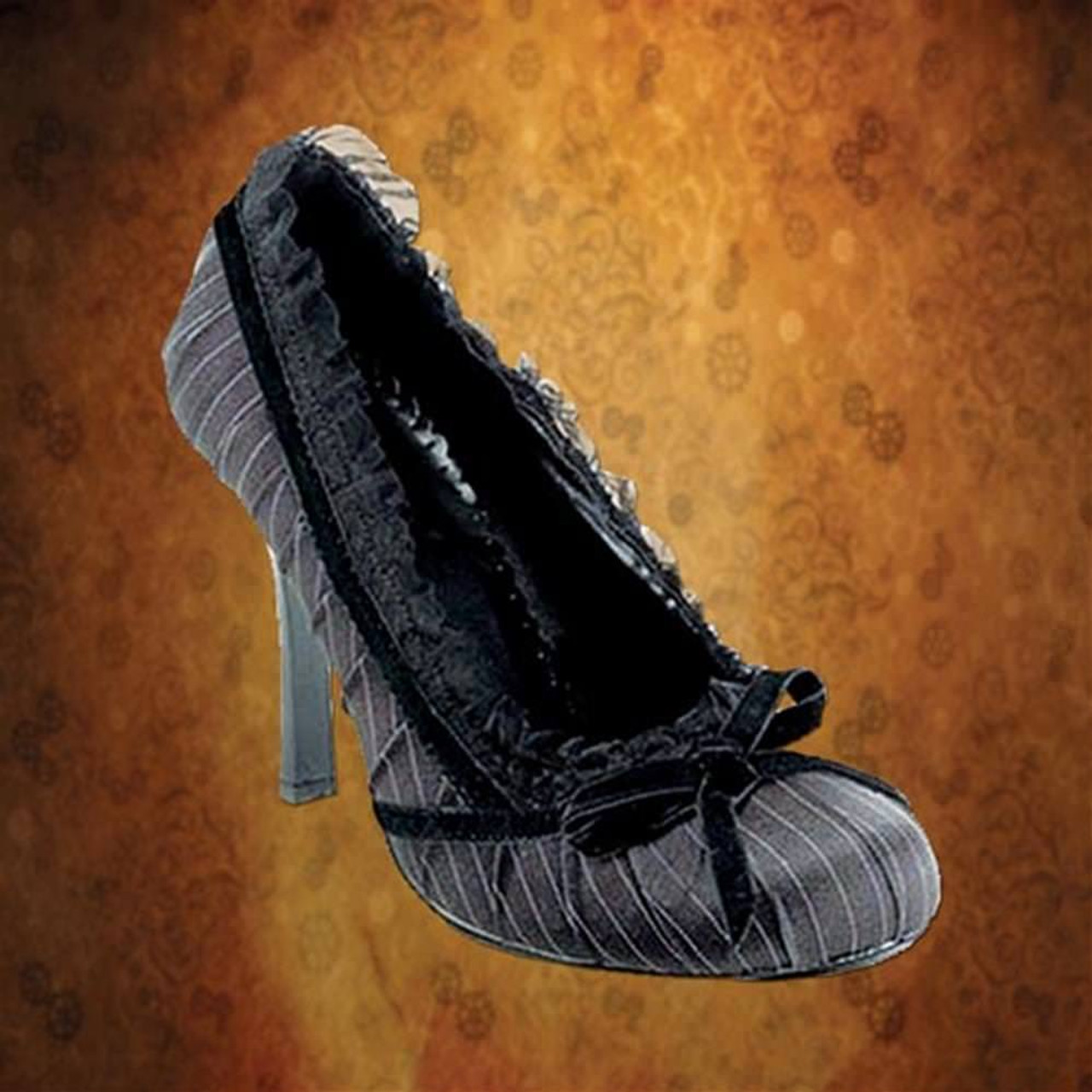 These Girlie Pumps have pleated black and white pin striping with a 3-1/2″ heel. This cute black satin shoe has a ribbon accent. Available in whole sizes 6 – 9.