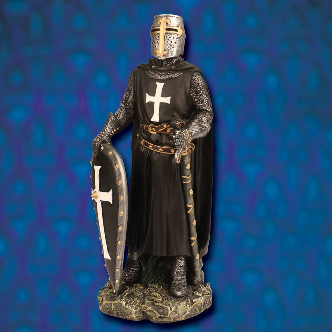 This statue depicts one of the most formidable warriors of the Crusades. The Knight Hospitaller is wearing the heraldry of his order. Made of resin, it has been elaborately painted. Templar Knight Painted Statue also available.