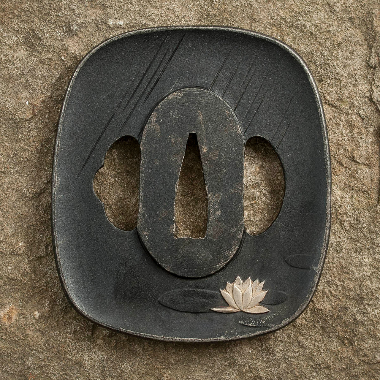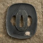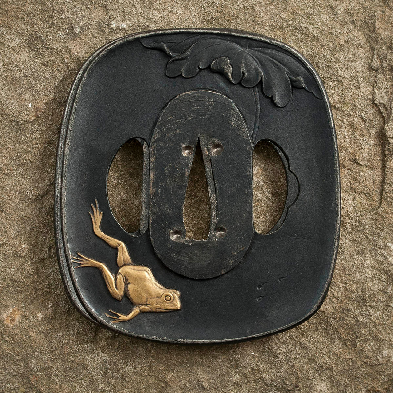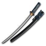 This wakizashi from Hanwei is made of hand-forged and folded K120C steel. The rayskin same has a blue cotton wrap and the black fuchi and kashira have brass detailing. The stainless steel tsuba has a blackened iron finish and depicts a frog jumping from a lily pad, beautifully detailed in silver and gold. One-piece brass habaki. The black lacquered saya has a dark blue and moss green silk sageo with polished buffalo horn kojiri, koiguchi and kurikata.