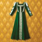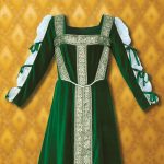 This elegant gown could easily be seen traversing the royal court of King Henry VIII. The rich green, 100% cotton velvet body gives a form-fitted appearance and is exquisitely accented with gold sequined trim. The sleeves have a sheer soft netting and are finished with matching green bows. Dry clean only.