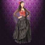 This Senorita black overskirt is a rich layered full skirt with enforced edging and lace back. Poly satin, choice of S/M or L/XL. Looks great when paired with underskirt.