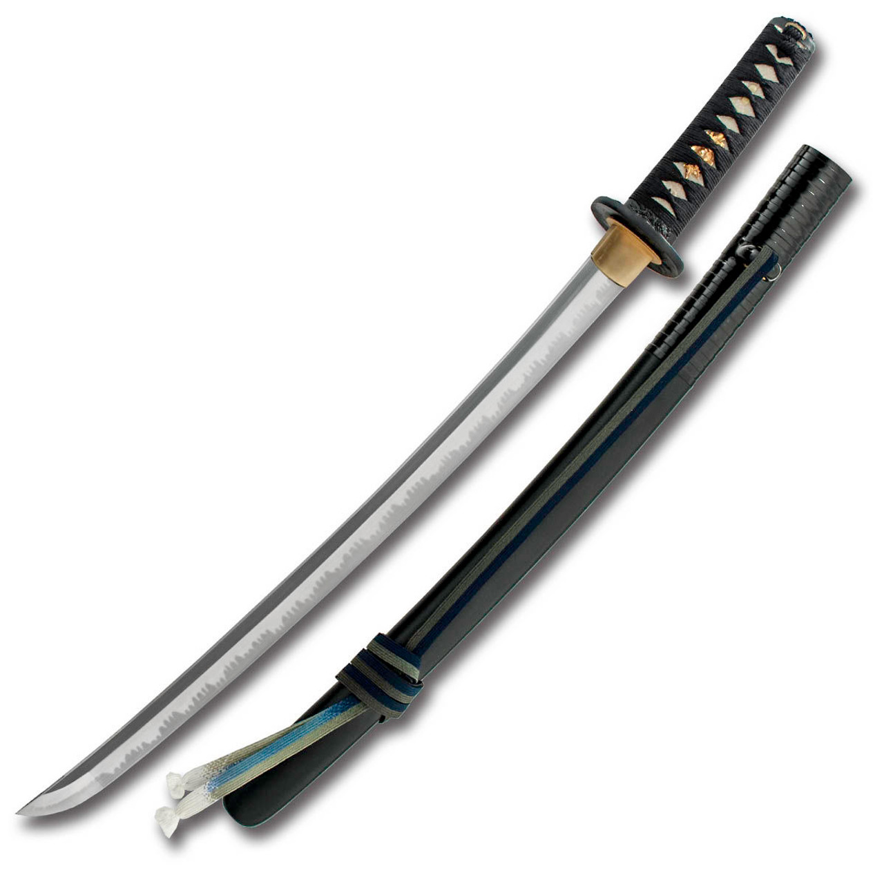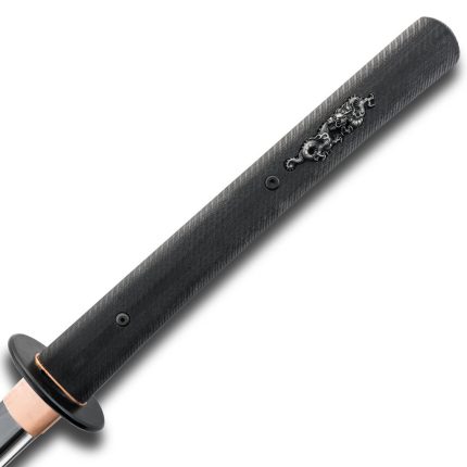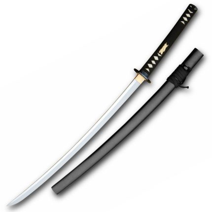 Invoking the ancient guardians known as lion dogs, the Lion Dog Wakizashi features them prominently on the black iron tsuba. This short sword also has a matching fuchi/kashira and golden peony menuki. To make sure the blade is as tough as these legendary creatures, the sword has a blade of Hanwei’s very own HWS-1S steel making an extremely reliable blade with edge-holding capability. The saya features a gloss-lacquered ribbed section at the koiguchi (mouth) and kurikata (knob). Included is a multi-colored sageo of hand-woven pure silk.