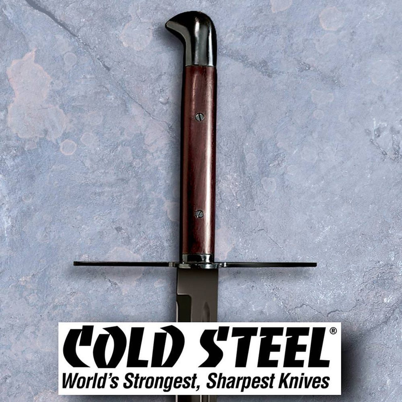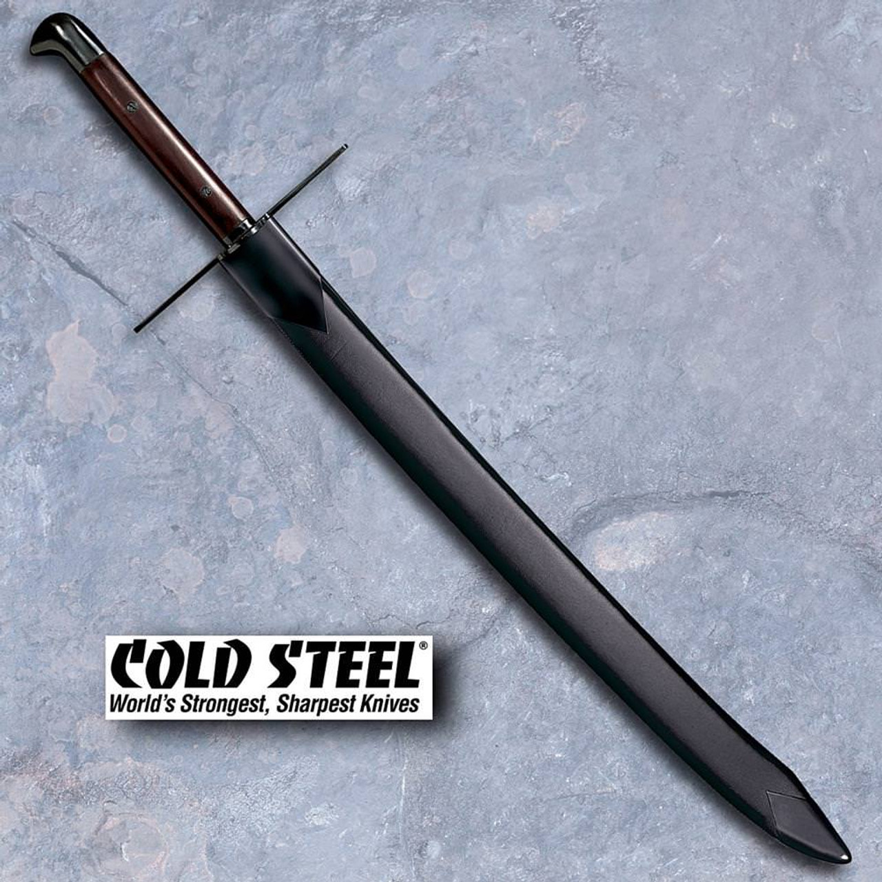The fully sharpened and blued blades have a distinctive gun metal finish that compliments their handles, and when well-oiled they are gleamingly beautiful in their own right.  Includes leather scabbard with blued steel fittings. From the Cold Steel Man at Arms series.