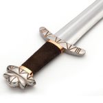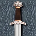 The Battle of Stiklestad was the final battle of St. Olaf. This was old-school warfare, with two hosts meeting face-to-face and sword-to-sword. It was a brutal, bloody, and deadly fight, and in the end, the mighty Olaf fell. Gaining a lot of fame for his exploits, he was eventually canonized as St. Olaf. This attractive Viking sword is copied from a specimen that was quite involved in that kind of vicious encounter.