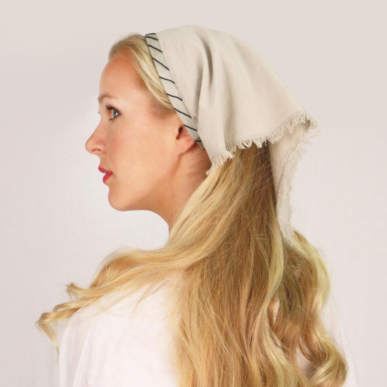 These cute scarves are a wonderful fashion accessory for a multitude of time periods and outfits, from Viking to Medieval and early Renaissance. Perfect for maidens of all lages. Made from a soft cotton, each scarf has fringed edging and is available in Dusty Blue with a matching 1/2” trim in the front or Natural Ivory with a black, faux stitched edging.