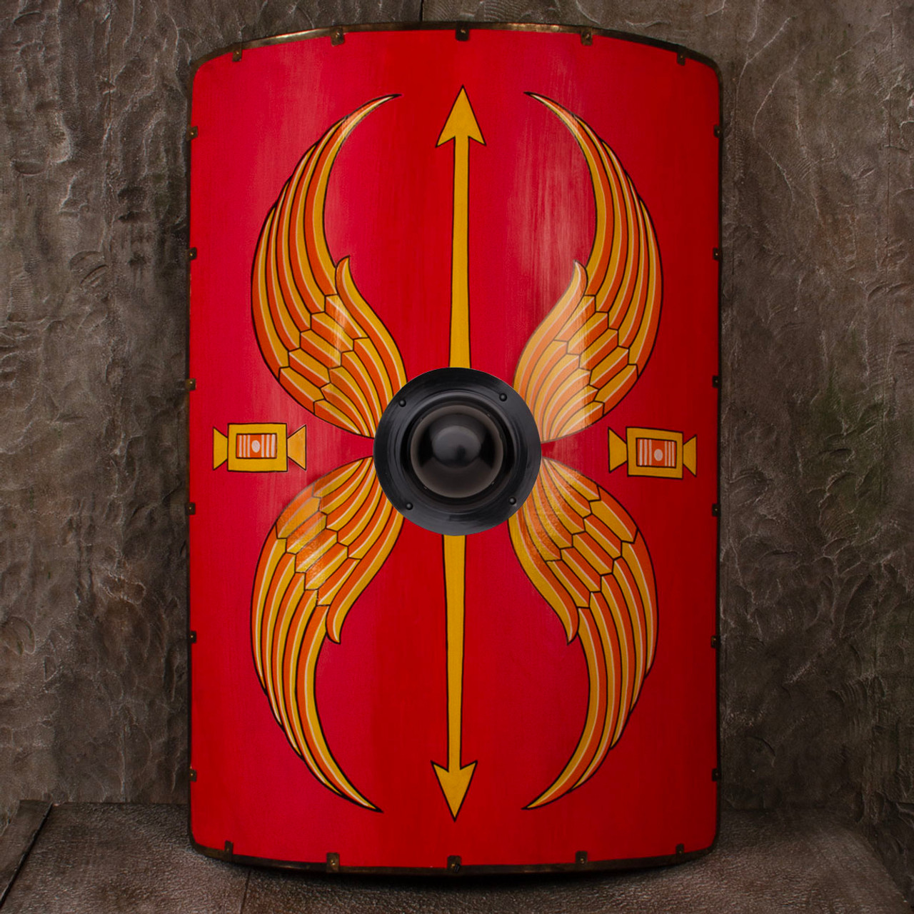 This Roman Legionnaire’s Scutum is the widest reproduction shield we’ve ever offered! Roman soldiers grouped themselves tightly together and used these shields for total body protection as they advanced on the battlefield. This shield is featured in a blockbuster sequel film about ancient Rome. The polished steel boss provides a “nest” for the hand and doubles as a punching weapon in close-quarters combat. Wood construction with brass rims that have been given an aged finish. The back features a linen liner and wood reinforcing bands. Wood grip and a round boss.